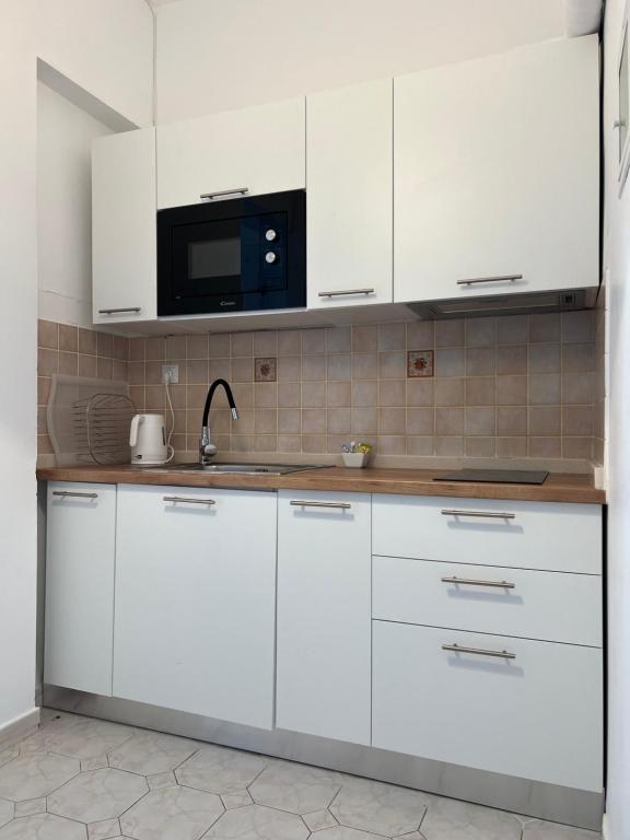 Fully equipped kitchenette with stovetop, microwave, fridge, coffee machine, and kitchenware